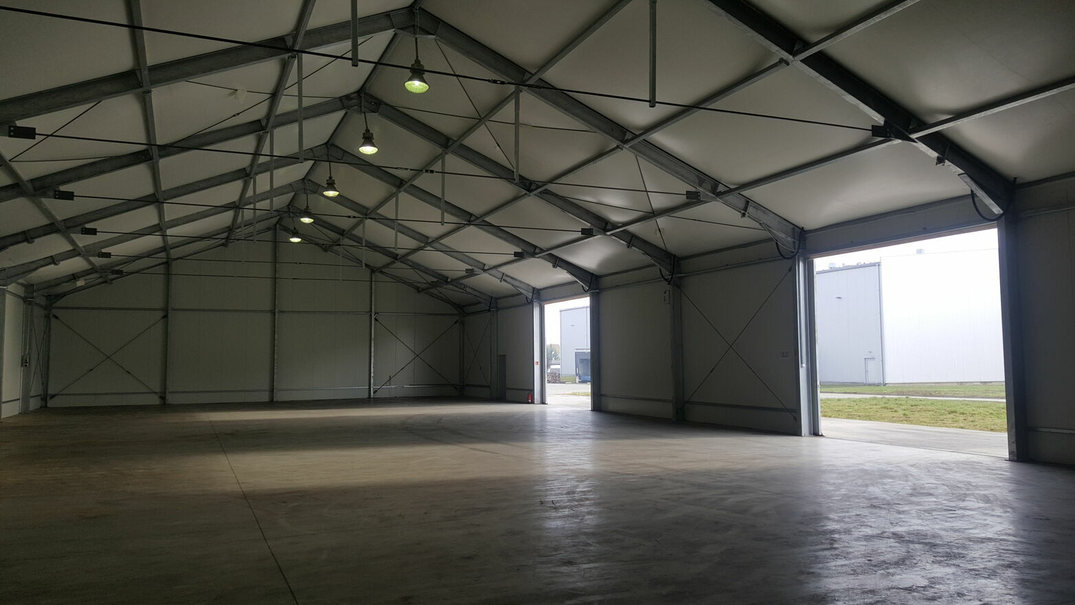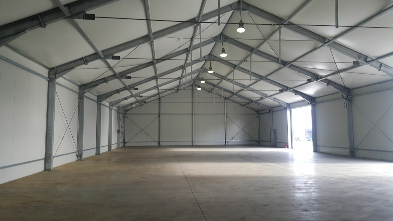 Konstrukcja ocynkowana, płyta warstwowa poliuretan 6 cm, dach dwuspadowy -plandeka pneumatyczna (pompowany), kont nachylenia dachu 22 stopnie, hala bez słupów w środku.