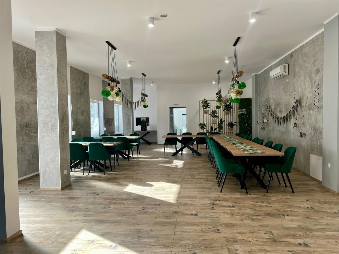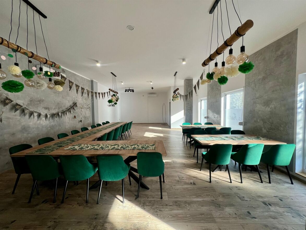 • Sala główna ok. 104 m² - jasna i przestronna, z czterema dużymi oknami (205×137 cm) wyposażonymi w żaluzje antywłamaniowe,
