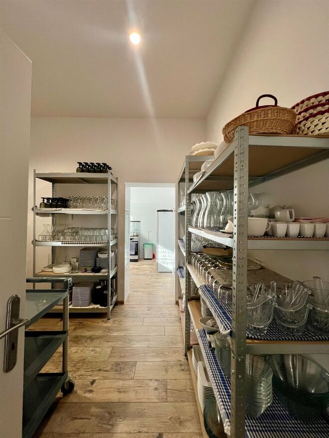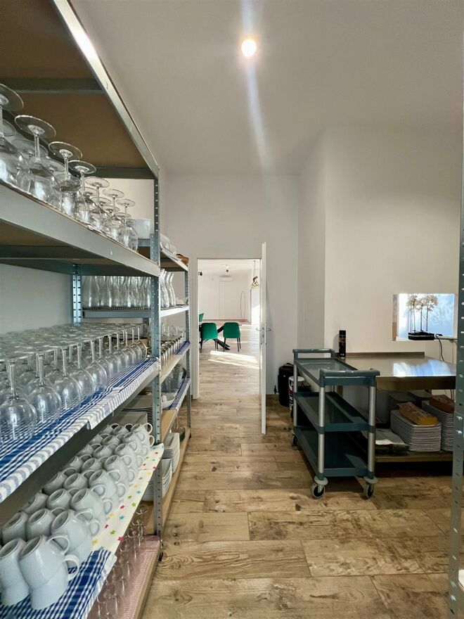 • Zaplecze wyposażone: zmywak, zmywarka, lodówka, mikrofala, kuchenka podręczna, stoły robocze,