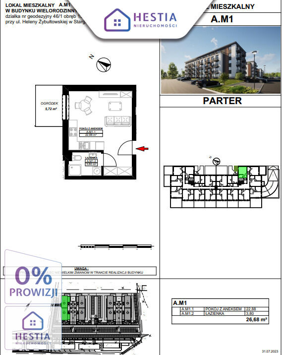 Na sprzedaż nowe mieszkanie 1-pokojowe w stanie deweloperskim opowierzchni 26,68 m² z ogródkiem 5,72 m² , idealne zarówno do