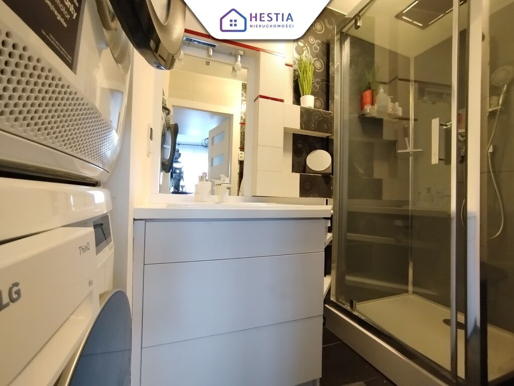* łazienka z kabiną prysznicową, pralką i suszarką,