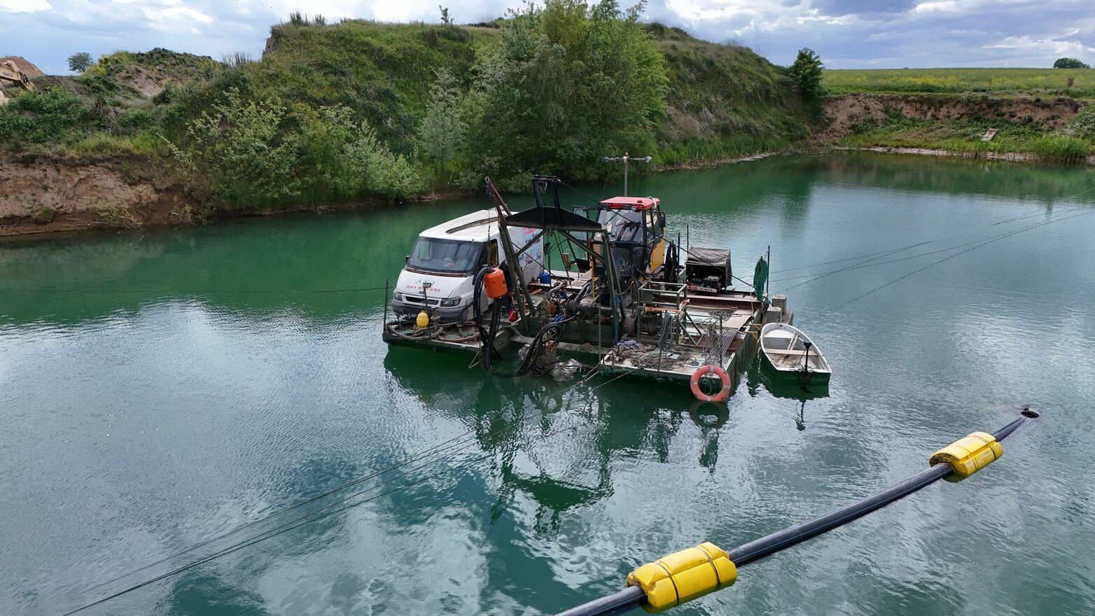 Refuler własnej produkcji (projekt, pontony wojskowe 3-komorowe, główne podzespoły, osprzęt, doposażenie), wykonanie.Pompa główna hydrauliczna Dragflow HY85HC z agitatorem – Włoski światowy lider