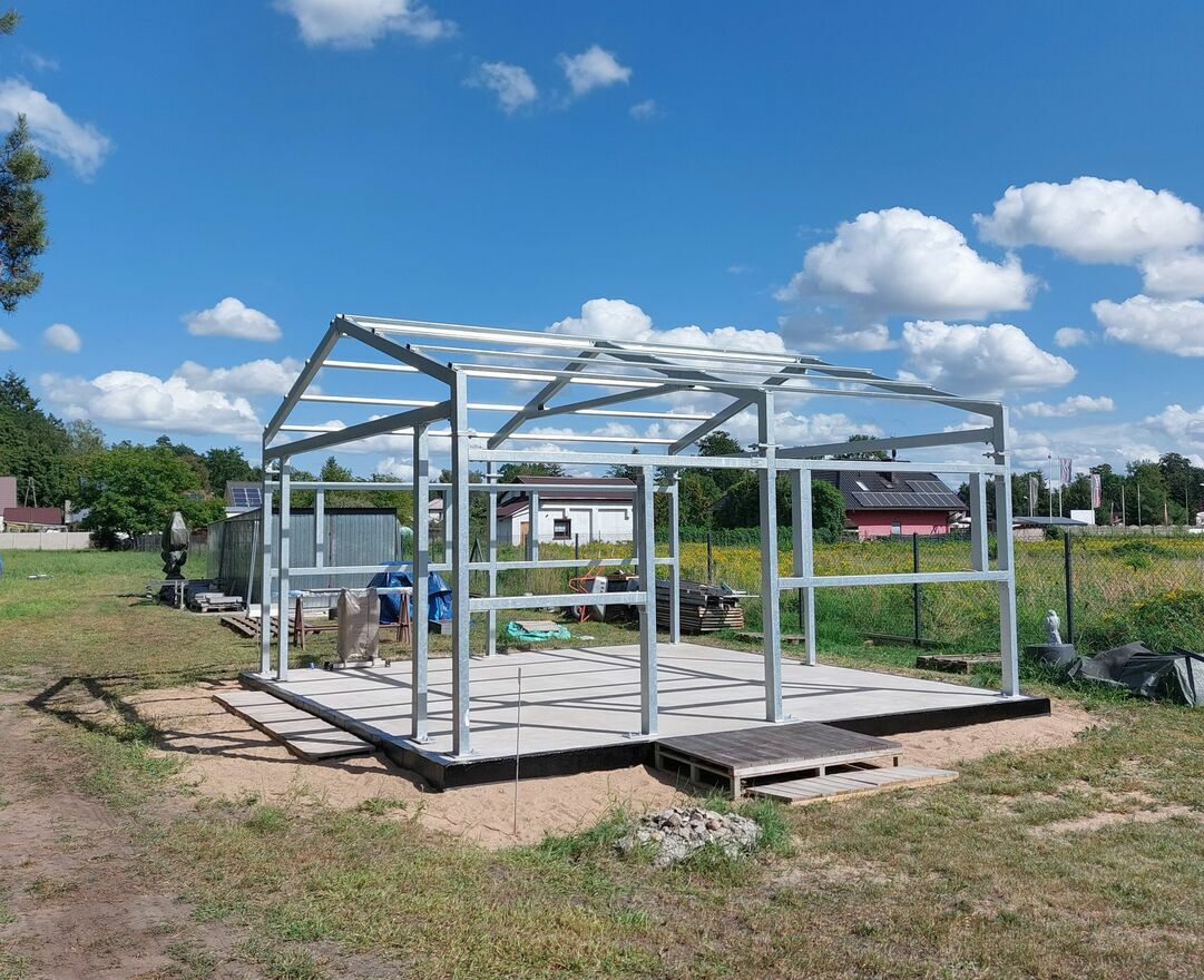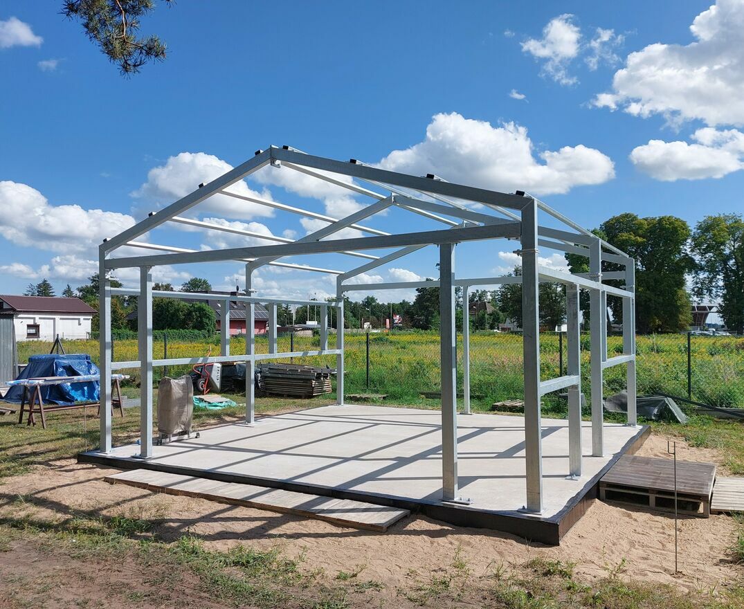 Oferuję solidną konstrukcję stalową garażu / warsztatu o wymiarach 5,8 m × 5,6 m.Wysokość kalenicy: 3600 mm + łaty 40 mm × 60 mm