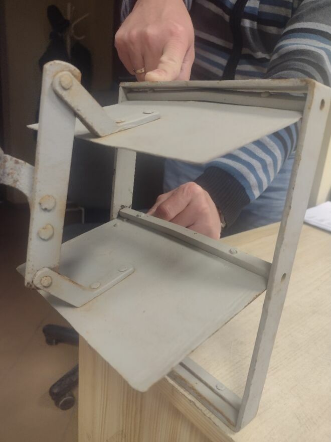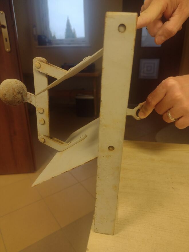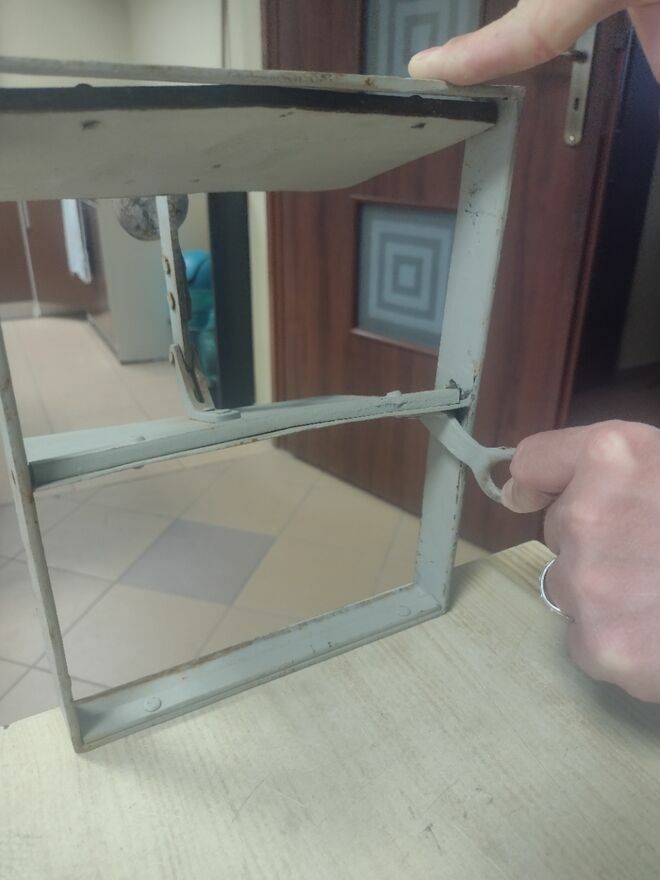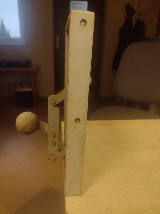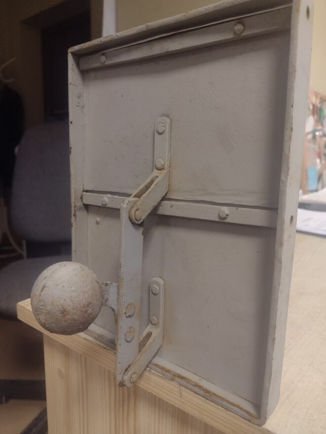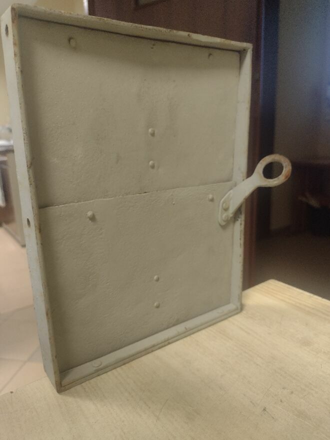 Zabytkowa kratka wentylacyjna z automatycznym zamknięciem za pomocą obciążnika. Otwiera się ciągnąc za dźwignię, do której mocuje się sznurek. W celu pozostawienia w pozycji otwartej, sznurek należy przywiązać do haka w ścianie. Stan jak na zdjęciu.Wymiary 25*19*2,5 cm